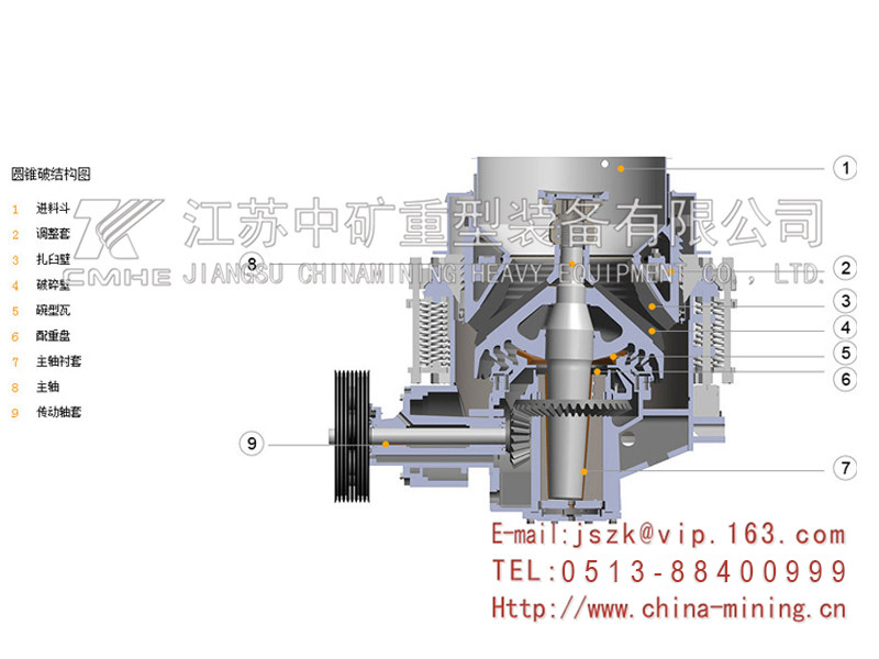 圓錐破碎機(jī)工作時(shí),電動(dòng)機(jī)的旋轉(zhuǎn)通過皮帶輪或聯(lián)軸器、圓錐破碎機(jī)傳動(dòng)軸和圓錐破碎機(jī)圓錐部在偏心套的迫動(dòng)下繞一周固定點(diǎn)作旋擺運(yùn)動(dòng)。從而使破碎圓錐的破碎壁時(shí)而靠近又時(shí)而離開固裝在調(diào)整套上的軋臼壁表面,使礦石在破碎腔內(nèi)不斷受到?jīng)_擊,擠壓和彎曲作用而實(shí)現(xiàn)礦石的破碎。電動(dòng)機(jī)通過傘齒輪驅(qū)動(dòng)偏心套轉(zhuǎn)動(dòng),使破碎錐作旋擺運(yùn)動(dòng)。破碎錐時(shí)而靠近又時(shí)而離開固定錐,完成破碎和排料。支撐套與架體連接處靠彈簧壓緊,當(dāng)破碎機(jī)內(nèi)落入金屬塊等不可破碎物體時(shí),彈簧即產(chǎn)生壓縮變形,排出異物,實(shí)現(xiàn)保險(xiǎn),防止機(jī)器損壞。圓錐式破碎機(jī)在不可破異物通過破碎腔或因某種原因機(jī)器超載時(shí),圓錐式破碎機(jī)彈簧保險(xiǎn)系統(tǒng)實(shí)現(xiàn)保險(xiǎn),圓錐式破碎機(jī)排礦口增大。異物從圓錐破碎機(jī)破碎腔排出,如異物卡在排礦石可使用清腔系統(tǒng),使排礦繼續(xù)增大,使異物排出圓錐破碎機(jī)破碎腔。圓錐破碎機(jī)在彈簧的作用下,排礦口自動(dòng)復(fù)位,圓錐式破碎機(jī)機(jī)器恢復(fù)正常工作。破碎腔表面鋪有耐磨高錳鋼襯板。排礦口大小采用液壓或手動(dòng)進(jìn)行調(diào)整。