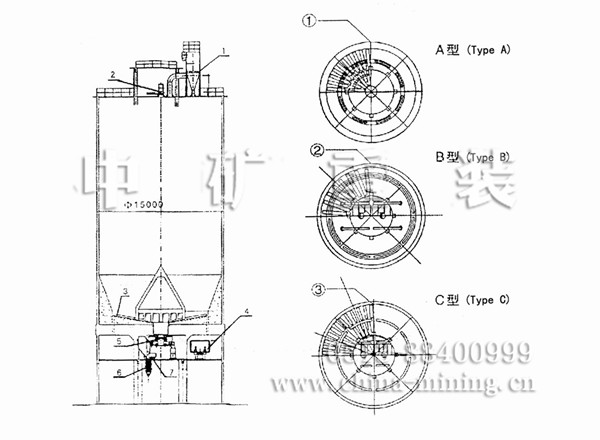 水泥儲存庫是在庫底中心位置設一錐形混合室,以降低庫內的卸料壓力,消除漏斗流。混合室 設8~12個進料孔,在混合室和庫壁之間的環形區設有8~12個充氣區,卸料時輪流向相對的環形小 區充氣,使部分水泥流向中心混合室。在自上而下的流動過程中,切割水平料層而產生重力混合作 用,進入混合室后又因混合室內的連續充氣攪拌而進一步均化。這種庫的均化值可達5~9。電耗 0.15~0. 30kwh / t.
