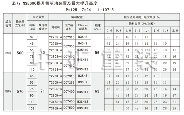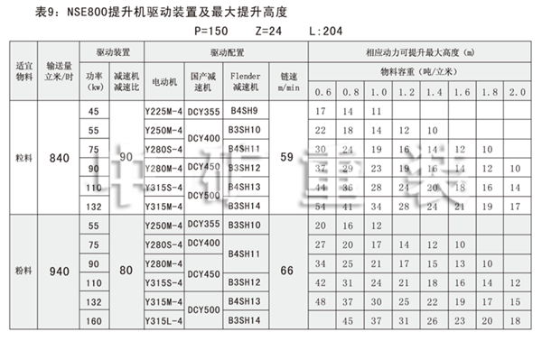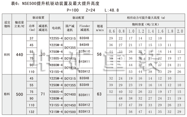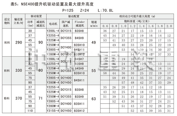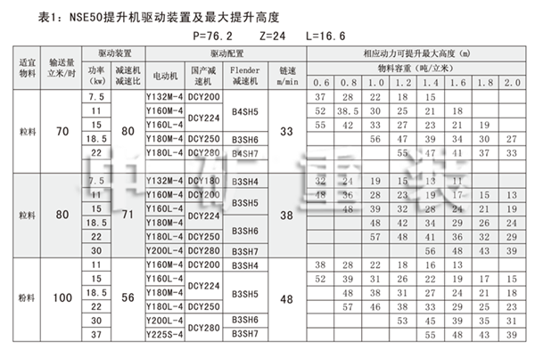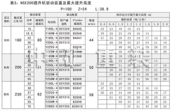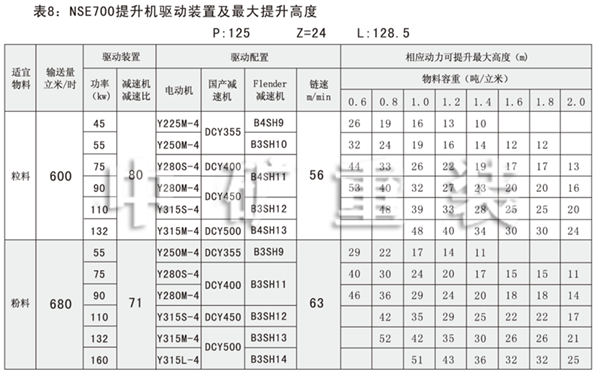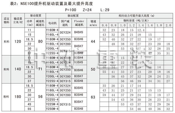 NSE系列高速板鏈斗式提升機共有九種基本型號:NSE100、NSE200、NSE300、NSE400、NSE500、NSE600、NSE700、NSE800、NSE1000,每種型號根據輸送物料的不同,選擇不同的提升速度,提升速度≤70m/min,提升高度65m。另外,中礦公司還可根據用戶要求輸送量介于上述型號之間的擴展型號。